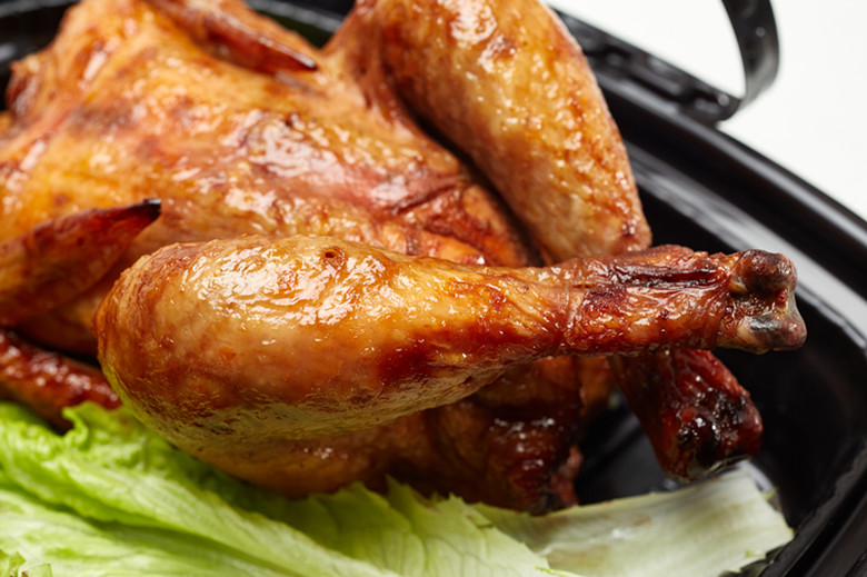 一位小朋友跟著媽媽來到店內,看到金黃金黃的烤雞,高興地說“媽媽,好香,我要大的!”媽媽說:“那就拿大的,”說完拿出百元大鈔,“我家小子老遠就聞著香味了,這開學了,買一只解解饞。”