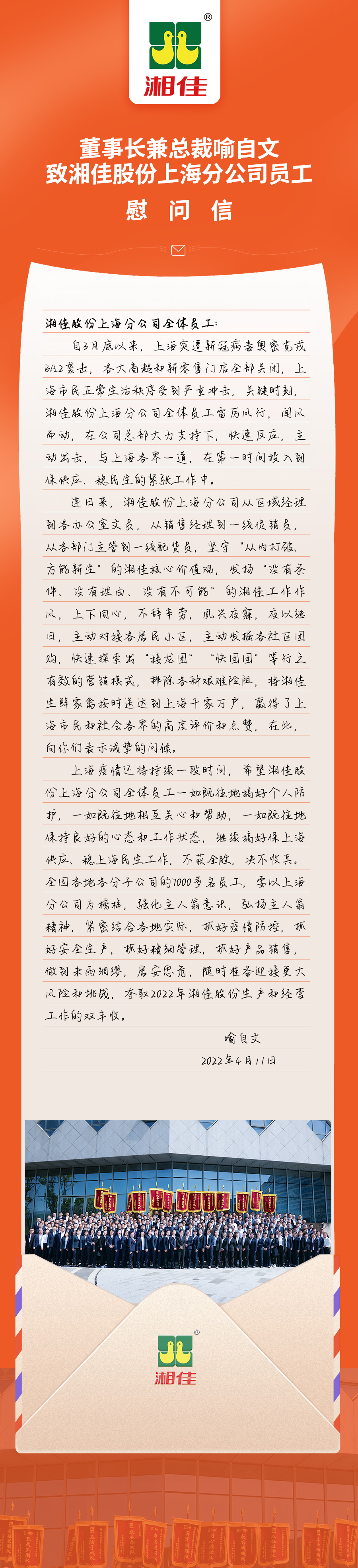 喻自文致湘佳股份上海分公司員工慰問信 發(fā)布人:文化部 發(fā)布日期:2022-04-11 5428次瀏覽 上一篇: 青春有我 筑夢湘佳|湘佳股份召開五四青年員工座談會 下一篇: 湘佳創(chuàng)業(yè)30周年慶祝大會:鳳領(lǐng)湘佳,五業(yè)齊飛
